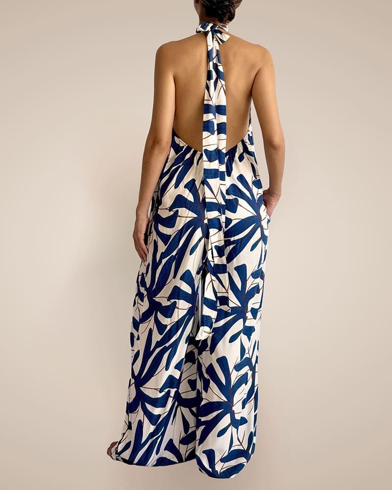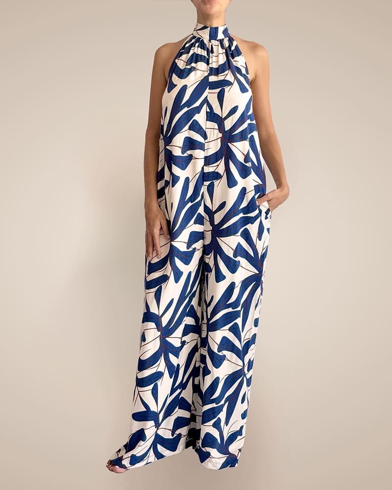 Es una prenda creada para cualquier ocasión, de silueta suelta. Cuello halter y corte amplio en la bota. Perfecta para usar con diferentes complementos o viajes por su diseño liviano y versátil.