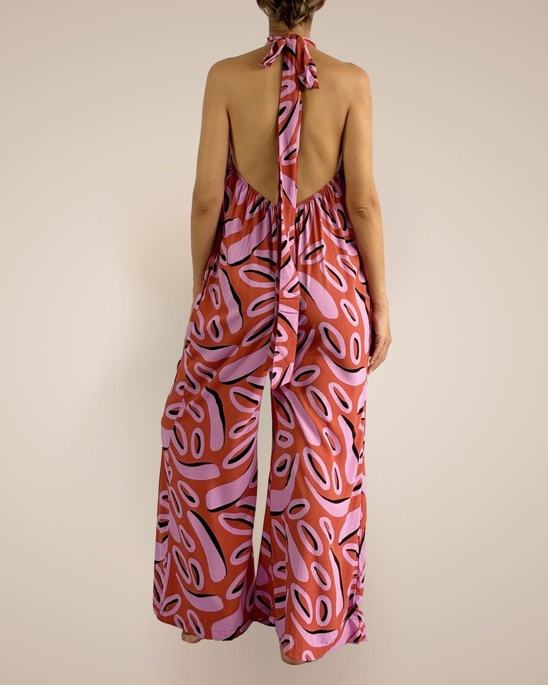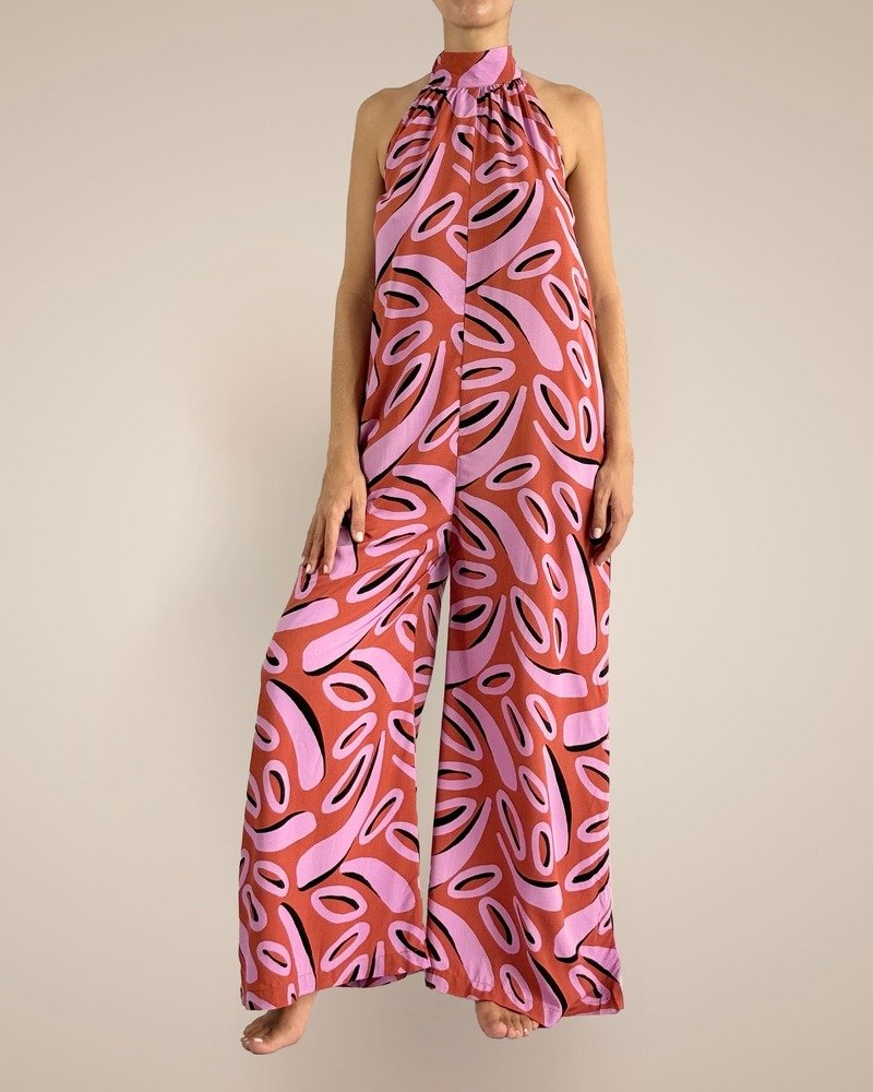 Es una prenda creada para cualquier ocasión, de silueta suelta. Cuello halter y corte amplio en la bota. Perfecta para usar con diferentes complementos o viajes por su diseño liviano y versátil.