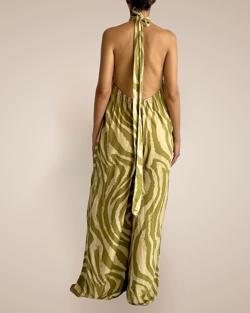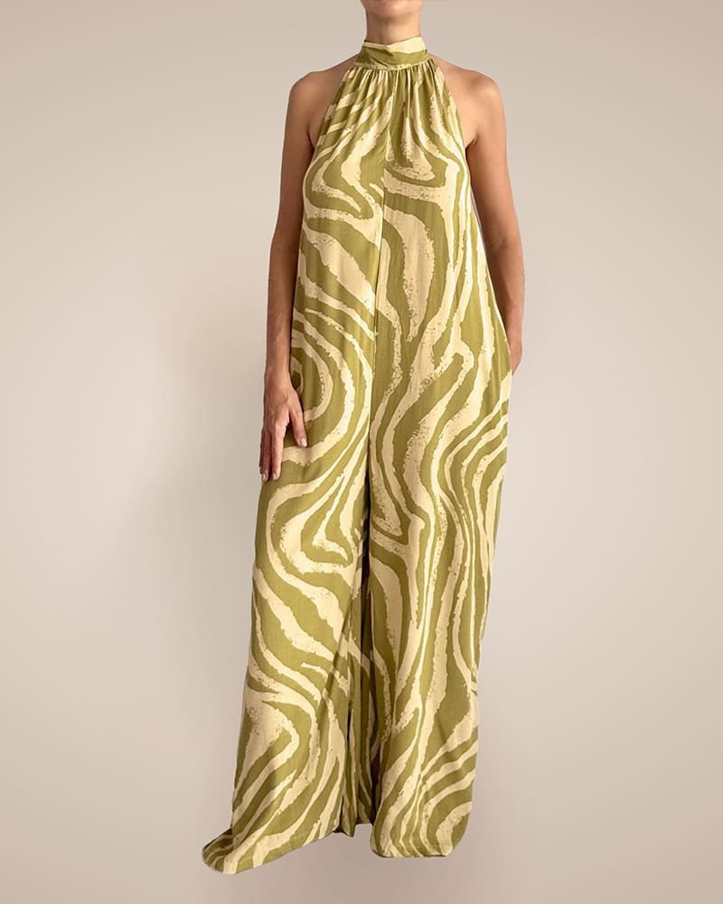 Es una prenda creada para cualquier ocasión, de silueta suelta. Cuello halter y corte amplio en la bota. Perfecta para usar con diferentes complementos o viajes por su diseño liviano y versátil.
