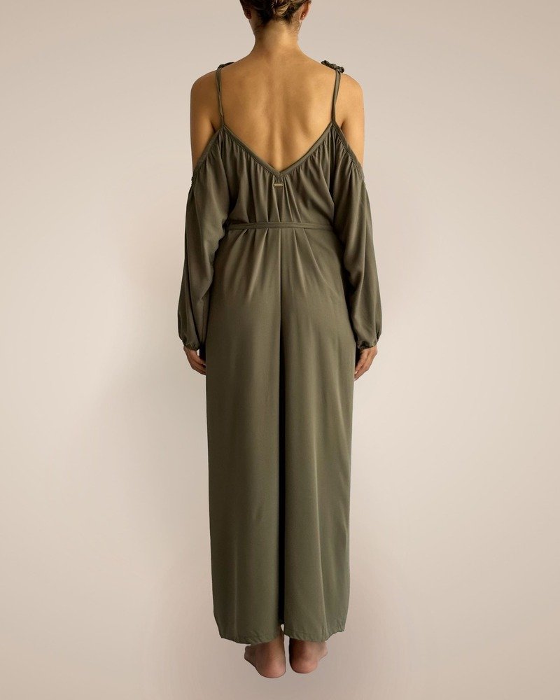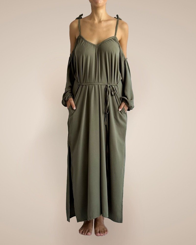 Es una prenda creada para cualquier ocasión, de silueta amplia con opción de ajuste en la cintura y abertura en los costados. Perfecta para usar con diferentes complementos o viajes por su diseño liviano y versátil.